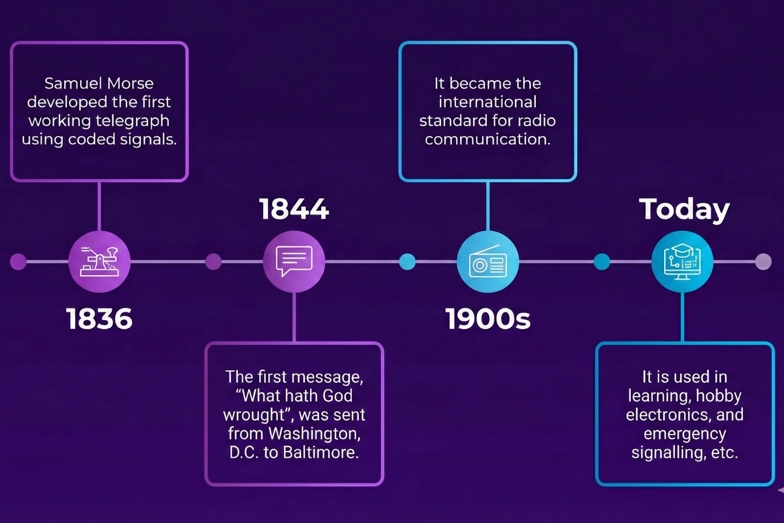 This code was invented in the early 1830s by Samuel Morse & Alfred Vail used for the electric telegraph for sending messages. It allowed people to send messages instantly across cities and countries. Over time, it became a global communication tool. Furthermore, it is also used as a supportive technology for people with disabilities.